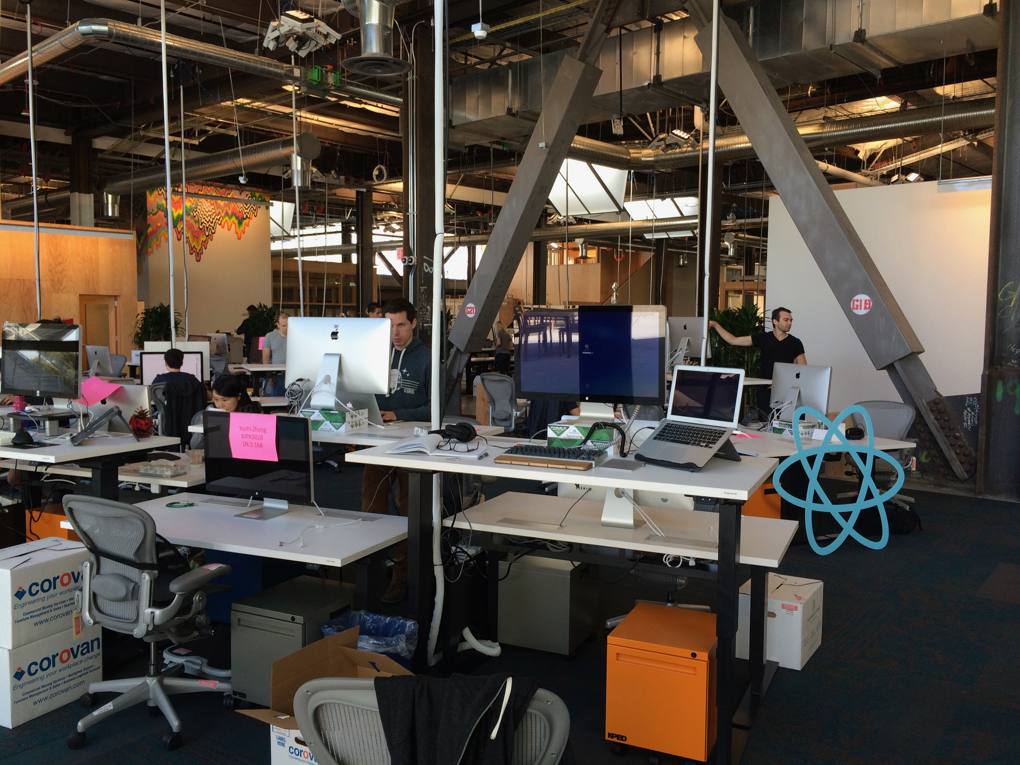 Fast-forward to 2015 and I just moved into this fancy building at FB along with the rest of Product Infrastructure. You get a standing desk! And you get a standing desk! You get a standing desk! Also, an "ergo consult" where they give you a real laptop stand and make sure your keyboard (now a Realforce) and display are at the right height. Some kind of Apple Monitor — I don't remember exactly which — but at that time it wasn't a 4K or Retina one. Some fun details in there, if you look closely, like a React logo leant casually against a desk, a glimpse of the corner of Zuck's "Acquarium" office in the background, and Joe Savona intently ripping through some some god-level-hard problem, as is his wont.